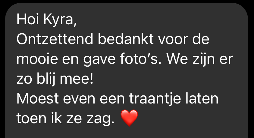 Kyra is in een woord geweldig. Maar dat zou een hele korte recensie zijn. Wij waren op zoek naar een trouwfotograaf en vonden Kyra online. Wat voor ons er toen uitsprong was dat ze snel en persoonlijk reageerden, in plaats van een standaard mailtje dat de aanvraag was ontvangen en er contact met je zou worden opgenomen. Nee, een net mailtje met brochure en later een belletje of we alles in goede orde hadden ontvangen.