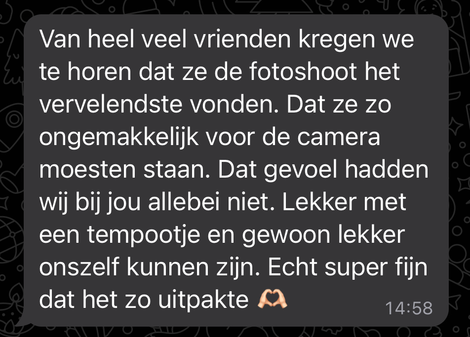 Ze steekt er veel tijd en energie in om je als bruidspaar echt te leren kennen. Eerst telefonisch contact, daarna een kennismakingsgesprek bij ons thuis en daarna nog een pre-shoot, op een locatie naar keuze, waardoor wij en onze kinderen even hebben kunnen wennen aan het voor de camera staan. Ze is ook super leuk met kinderen en dat hielp echt met onze dochter die foto’s maken eerst maar spannend vond. De pre-shoot leverde al hele mooie foto’s en dat beloofde dus wat voor de trouwdag.