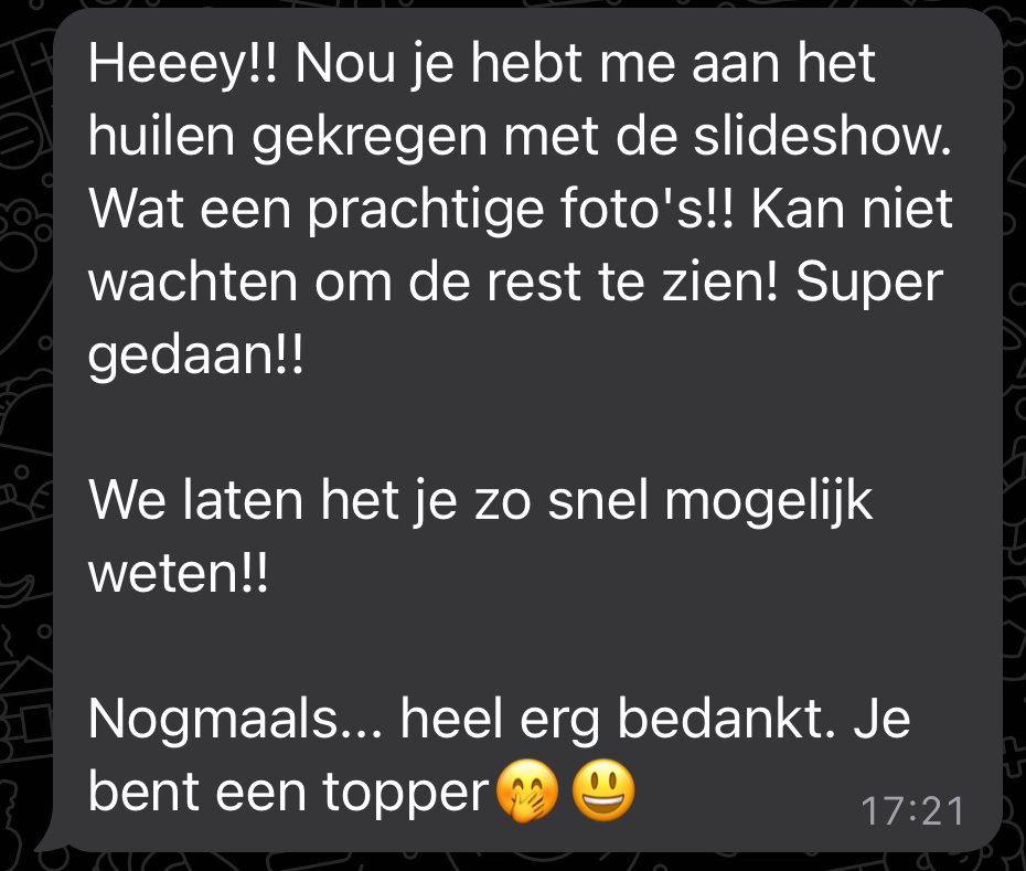 Op de dag zelf neemt ze je echt helemaal mee. Samen ben je er echt even uit, lekker bezig met de foto’s en je vergeet dan even al die zenuwen voor het huwelijk.